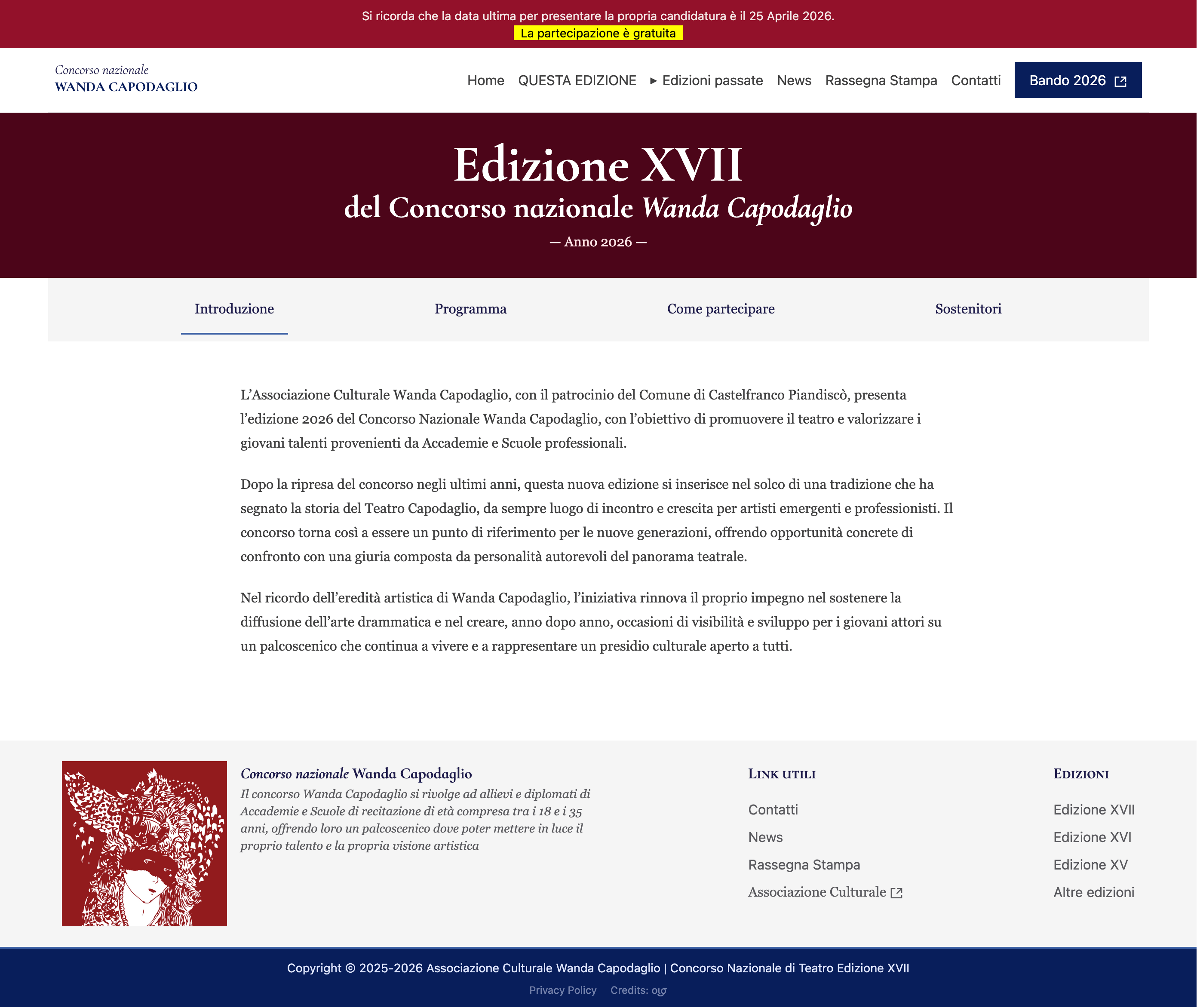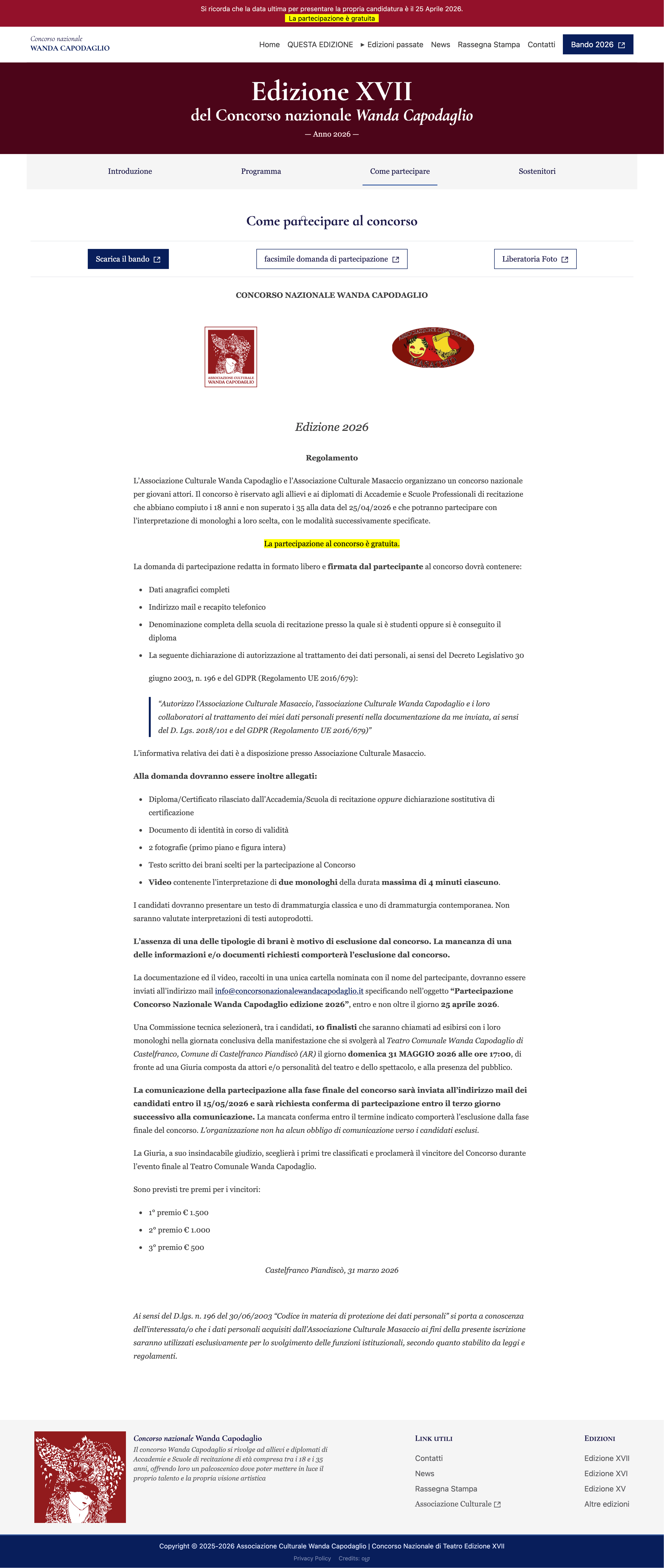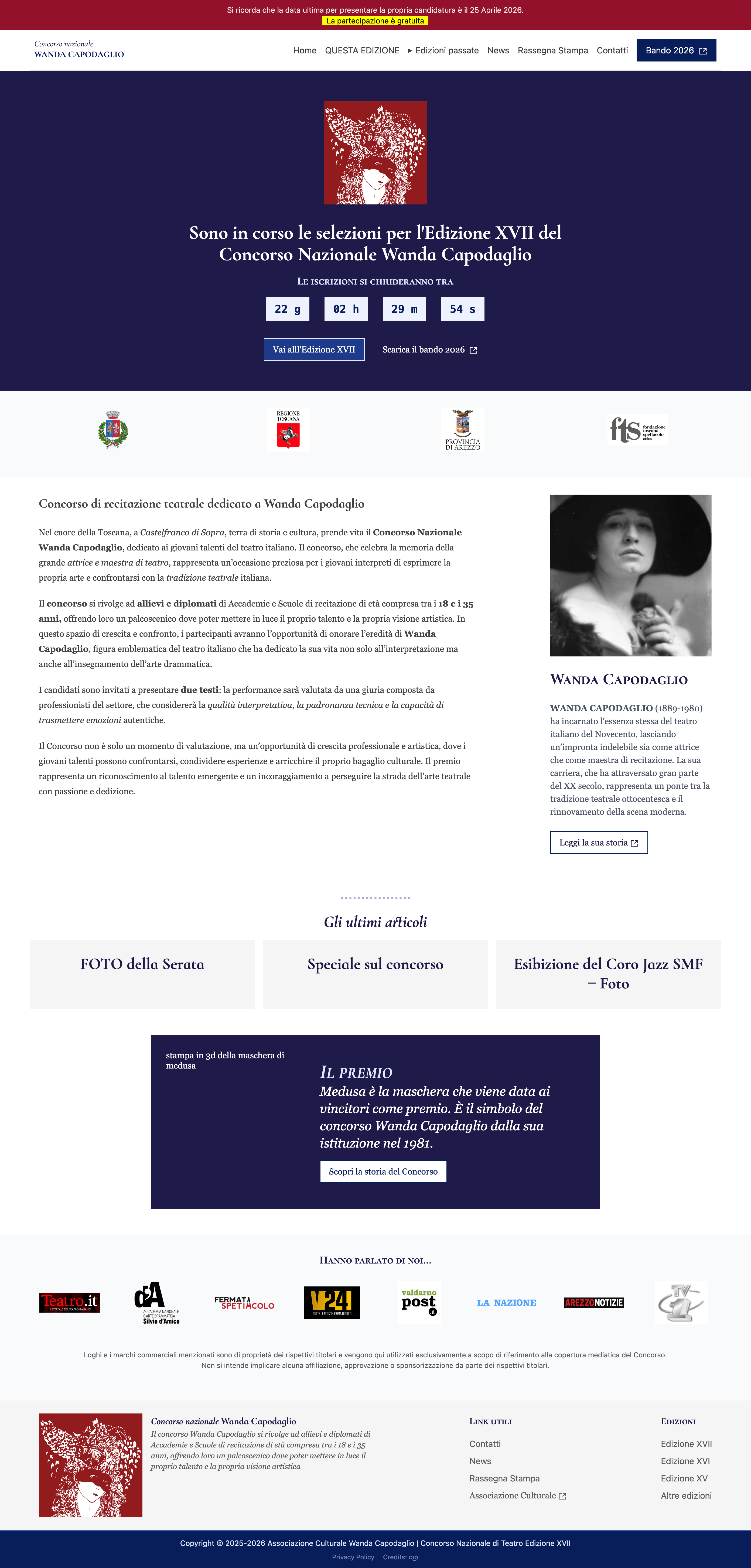 Mi sono occupato della progettazione e dello sviluppo di un tema WordPress custom per il Concorso Nazionale Wanda Capodaglio. Il vecchio sistema non permetteva una gestione agile dei contenuti e non rispondeva alle esigenze di accessibilità e usabilità del team organizzativo. Ho scelto di strutturare un sistema editoriale basato su Advanced Custom Fields (ACF), creando template dedicati e componenti frontend riusabili per gestire in modo semplice edizioni, finalisti, giuria, sponsor e documenti. L’obiettivo era rendere il sito facilmente aggiornabile e più inclusivo nella fruizione. Ho curato la struttura informativa, lo sviluppo in PHP, Tailwind e JavaScript, e l’ottimizzazione della navigazione. Particolare attenzione è stata data all’accessibilità: ho inserito landmark semantici (header, nav, main, aside, footer). Ho utilizzato classi sr-only per etichette contestuali (navigazione articoli, metadati post, pulsanti menu e slider) e implementato pattern ARIA avanzati, come tablist/tab/tabpanel sulla pagina edizione, con gestione di aria-selected, aria-controls e hidden.